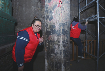 4月10日,張靜通過敲擊聽音來檢測正殿后檐金柱有無中空現(xiàn)象。