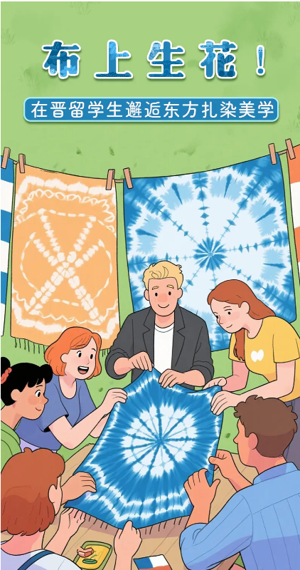 國際青年們認真聆聽扎染的歷史淵源與工藝精髓,并通過分步演示,親自體驗“絞纈”技法。留學(xué)生們在素色方巾上折疊、捆扎、浸染,創(chuàng)作出各具特色的紋樣。