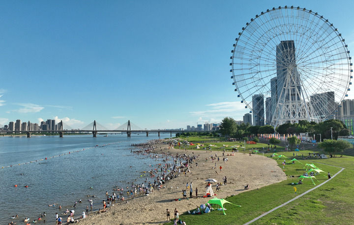 游人在位于江西省南昌市紅谷灘區(qū)的摩天灣天然泳場戲水納涼(6月27日攝)。新華社記者 萬象 攝