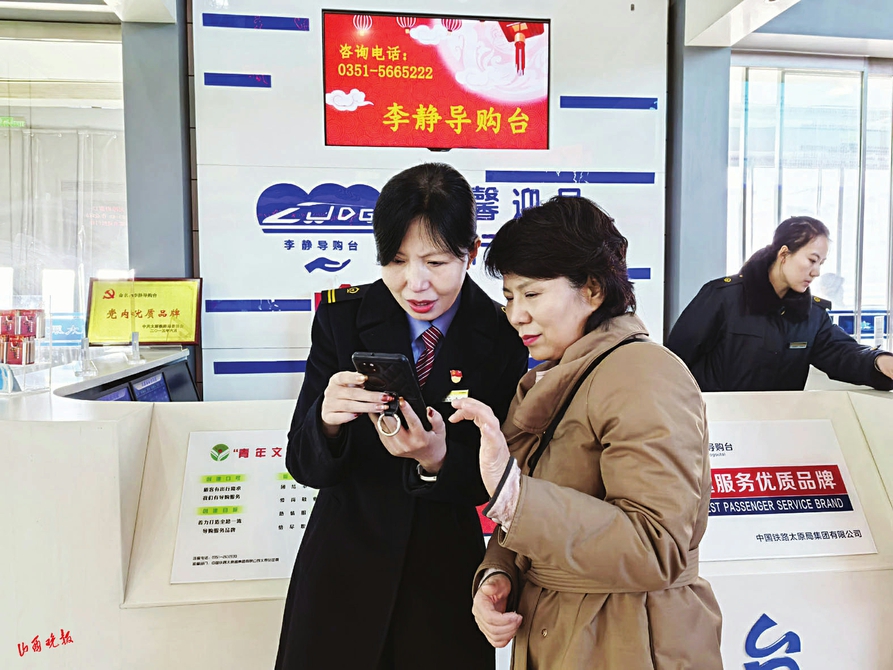 2月7日9時(shí)15分,太原南站候車(chē)大廳電子屏滾動(dòng)顯示著最新的車(chē)次信息,節(jié)前返鄉(xiāng)客流迎來(lái)一波小高峰,廣播里循環(huán)播報(bào)著靜音車(chē)廂、重點(diǎn)旅客服務(wù)、余票查詢(xún)等溫馨提示?!袄铎o導(dǎo)購(gòu)臺(tái)”前依舊圍滿(mǎn)了問(wèn)詢(xún)的旅客,此起彼伏的咨詢(xún)聲里,李靜與兩名值班員分工協(xié)作,一人負(fù)責(zé)退改業(yè)務(wù)引導(dǎo),一人負(fù)責(zé)重點(diǎn)旅客信息登記,李靜站在最外側(cè),直面旅客最急切、最棘手的各類(lèi)需求。
