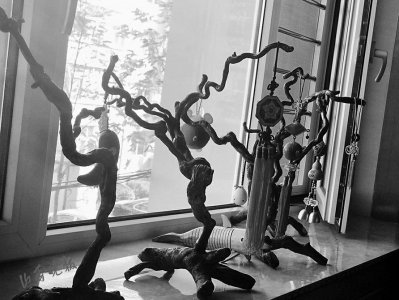 見(jiàn)到牛鳴遠(yuǎn)時(shí),他正忙著在家中的陽(yáng)臺(tái)上懸掛兩個(gè)大樹(shù)枝?!斑@是棗樹(shù)枝,還有點(diǎn)濕,得掛起來(lái)晾干后才能再進(jìn)行加工?!迸xQ遠(yuǎn)說(shuō),朋友收拾平遙老家的房子時(shí),砍了院子里的大棗樹(shù),知道他喜歡根雕,就專門(mén)運(yùn)回來(lái)一些送給他。