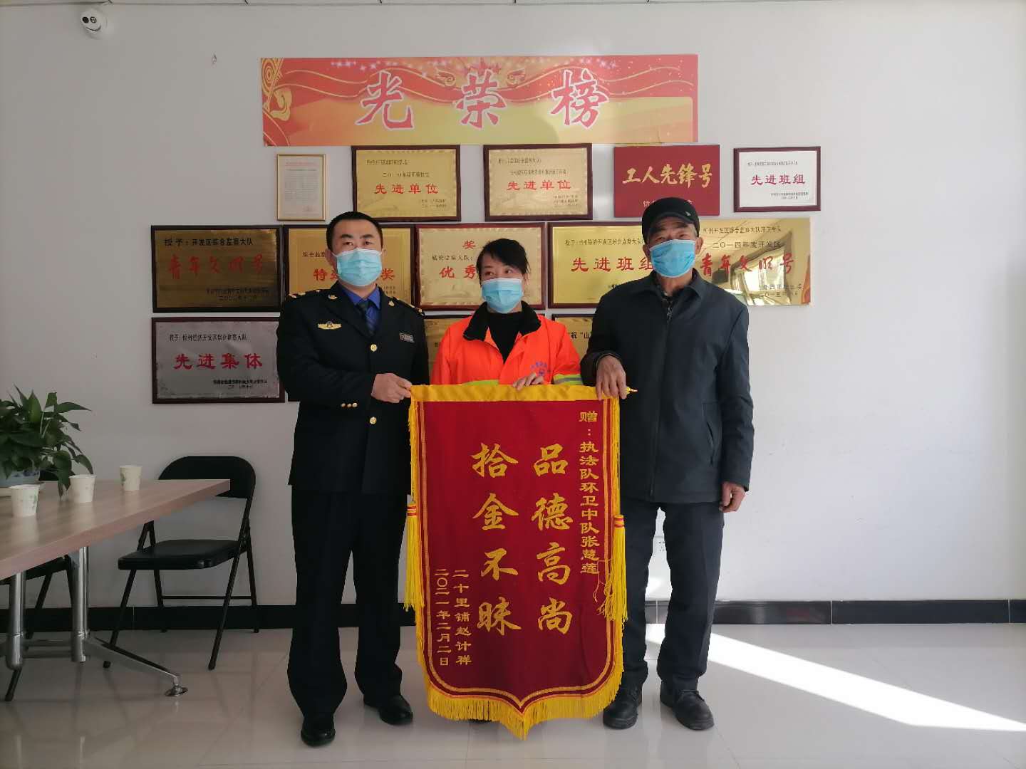 “真是遇到了好心人,我們一家人這下可以安心過(guò)個(gè)年了!……”當(dāng)泛華小區(qū)門衛(wèi)趙大爺親手接過(guò)失而復(fù)得的巨額現(xiàn)金時(shí),抑制不住內(nèi)心的激動(dòng),緊緊握著環(huán)衛(wèi)女工張慧蓮的手不停地道謝,并送上全家人的心愿“拾金不昧 品德高尚”錦旗。