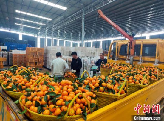 1月5日,在廣西南寧市西鄉(xiāng)塘區(qū)雙定鎮(zhèn)義平村,村民將剛采摘的砂糖橘打包裝箱供應(yīng)中國東北市場。中新社記者 黃艷梅 攝