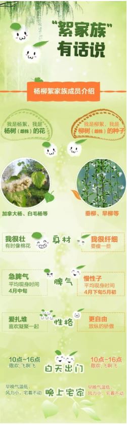 以華北地區(qū)最早開始飄絮的白毛楊為例,當(dāng)日平均氣溫大于0℃時,白毛楊才能正常生長發(fā)育,將這些超過0℃的數(shù)值累加起來,當(dāng)總和達(dá)到480℃,且日平均氣溫達(dá)到14℃,楊絮就開始飄飛。華北一帶,往往4月上旬前后達(dá)到這一標(biāo)準(zhǔn)。楊絮飄飛10余天后,柳絮也會進(jìn)入飄飛期。