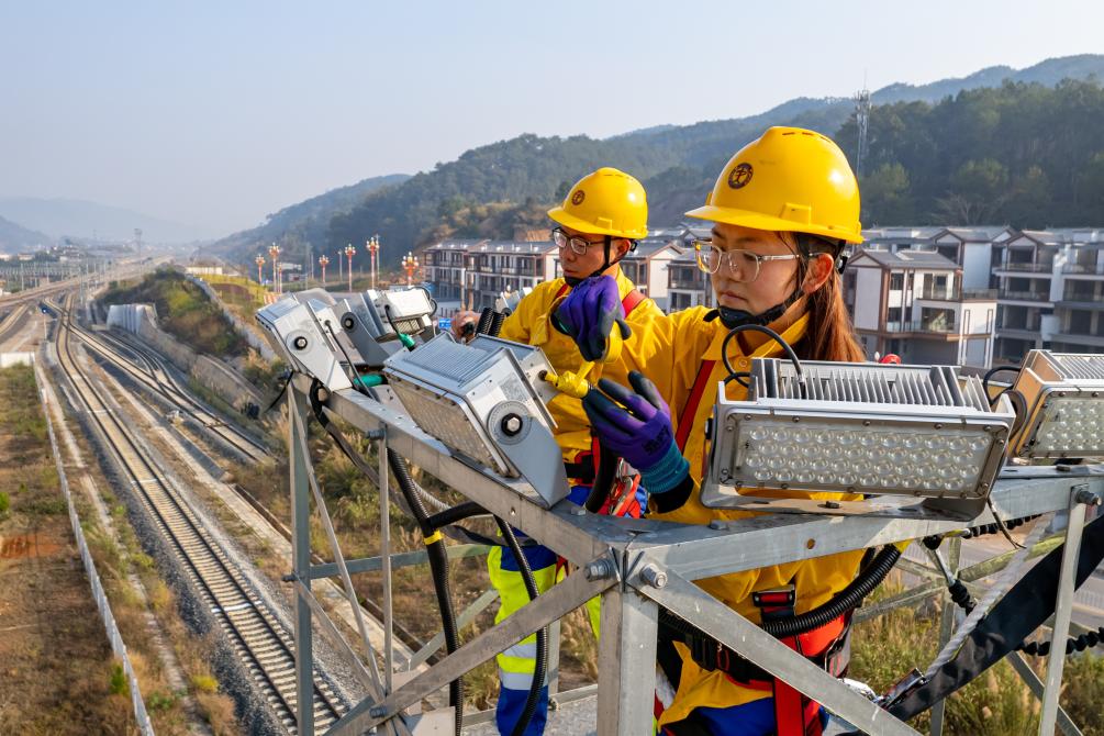 3月7日,中國鐵路昆明局集團(tuán)有限公司“00后”女電工王華欽(右一)在中老鐵路寧洱站貨運場檢修燈塔(無人機照片)。新華社發(fā)(殷學(xué)合 攝)