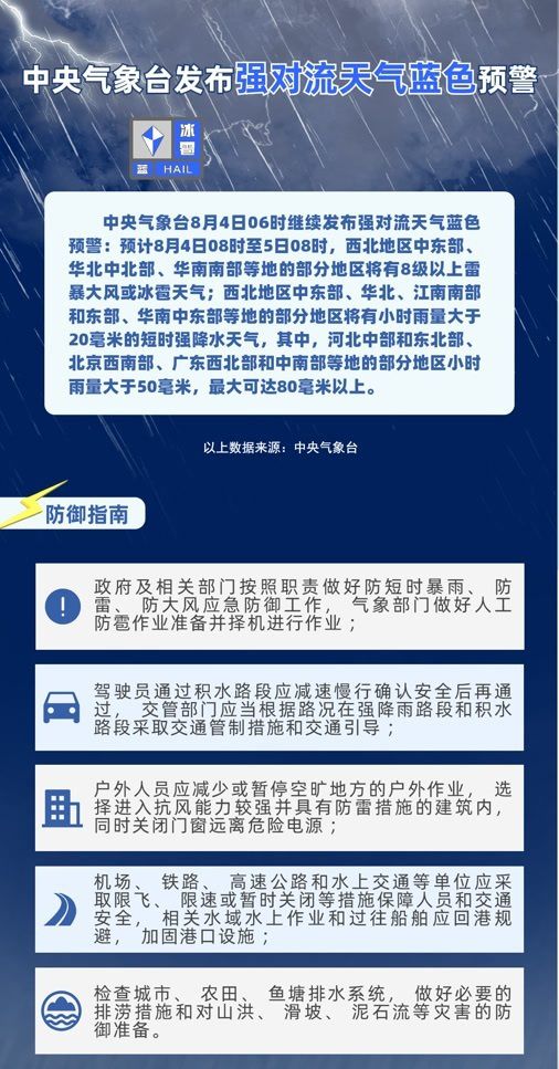 8月4日6時,中央氣象臺發(fā)布暴雨橙色、高溫橙色、強對流藍(lán)色三預(yù)警: