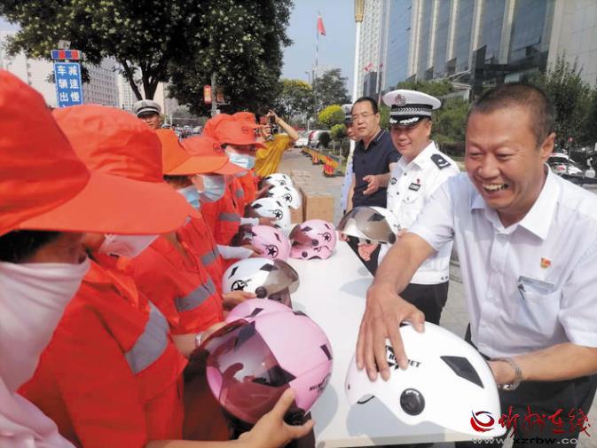 今年是我市創(chuàng)建全國文明城市的決戰(zhàn)決勝年,廣大環(huán)衛(wèi)工人一直默默奮斗在崗位上,為我市創(chuàng)文不斷努力。市公安局交警支隊始終牽掛著奮戰(zhàn)在基層一線的環(huán)衛(wèi)工人,支隊以此次贈送頭盔活動為契機,持續(xù)關(guān)心關(guān)愛環(huán)衛(wèi)工人的生命安全和身體健康。市公安局交警支隊負(fù)責(zé)人表示:“環(huán)衛(wèi)工人大多騎著電動三輪車或人力保潔車穿梭在大街小巷,機動車道是他們的主要作業(yè)區(qū)之一,佩戴安全頭盔,可以大大增加他們的安全系數(shù)。同時,環(huán)衛(wèi)等重點行業(yè)的示范引領(lǐng)作用,將有力帶動市民遵紀(jì)守法、安全出行,為文明城市創(chuàng)建打造一道亮麗的風(fēng)景線?!眻D為捐贈活動現(xiàn)場。張志遠 攝影報道