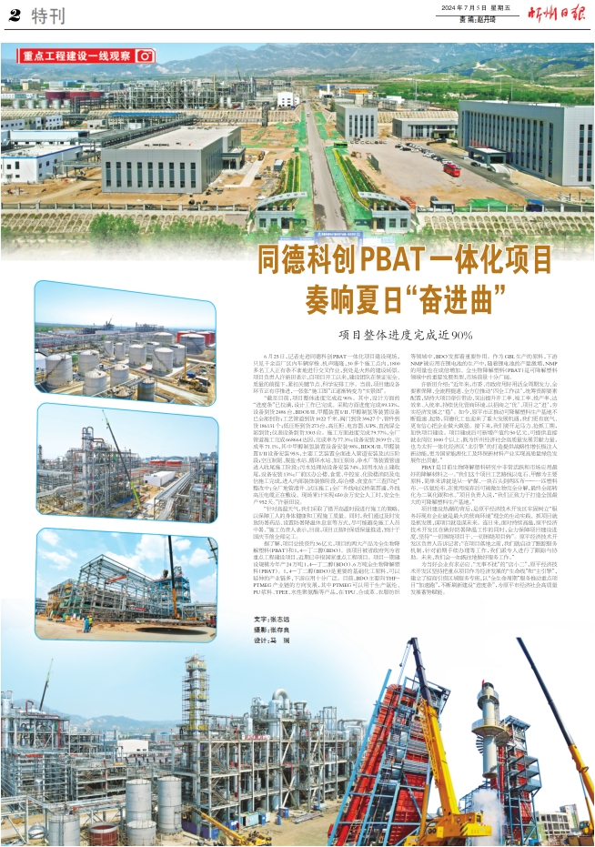 6月25日,記者走進(jìn)同德科創(chuàng)PBAT一體化項(xiàng)目建設(shè)現(xiàn)場,只見千余畝廠區(qū)內(nèi)車輛穿梭、機(jī)聲隆隆,30多個(gè)施工點(diǎn)內(nèi),1800多名工人正有條不紊地進(jìn)行交叉作業(yè),到處是火熱的建設(shè)場景。項(xiàng)目負(fù)責(zé)人許新田表示,自項(xiàng)目開工以來,建設(shè)團(tuán)隊(duì)在保證安全、質(zhì)量的前提下,緊扣關(guān)鍵節(jié)點(diǎn)、科學(xué)安排工序。當(dāng)前,項(xiàng)目建設(shè)各環(huán)節(jié)正有序推進(jìn),一張張“施工圖”正逐漸轉(zhuǎn)變?yōu)椤皩?shí)景圖”。