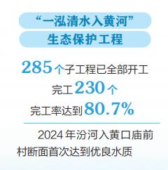 與此同時(shí),我省牢記習(xí)近平總書記寄予山西“一泓清水入黃河”的殷切期盼,2023年6月,啟動(dòng)了“一泓清水入黃河”生態(tài)保護(hù)工程,計(jì)劃用三年時(shí)間,對(duì)黃河的第二大支流——汾河,進(jìn)行全流域、全方位治理?!耙汇逅朦S河”生態(tài)保護(hù)工程在聚焦水質(zhì)改善目標(biāo)的基礎(chǔ)上,銜接水網(wǎng)建設(shè)、防洪能力提升、黑臭水體治理等多種類型,通過(guò)上下游、干支流、左右岸、水陸域一體謀劃,治污、調(diào)水、清淤、增濕、綠岸一體實(shí)施,取得了初步的生態(tài)效益、社會(huì)效益、經(jīng)濟(jì)效益。如今,285個(gè)子工程已完工230個(gè)、完工率達(dá)到80.7%。