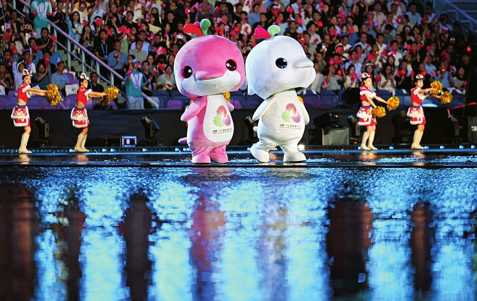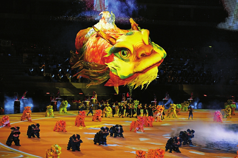 第十五屆全國運動會吉祥物“喜洋洋”和“樂融融”在開幕式現(xiàn)場表演。圖片均為開幕式表演現(xiàn)場。 本版圖片均來源新華社