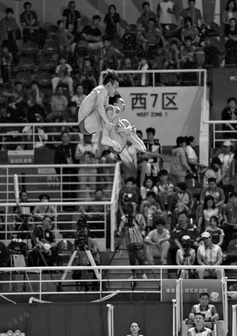 山西選手李政、梁朝輝在跳水項目男子雙人3米跳板比賽中。