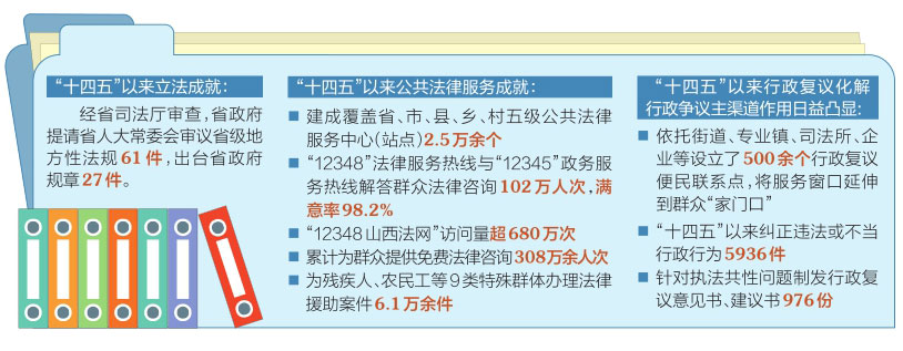 “十四五”以來,全省司法行政系統(tǒng)堅(jiān)持和發(fā)展新時(shí)代“楓橋經(jīng)驗(yàn)”,以法治力量維護(hù)社會(huì)和諧穩(wěn)定,助力建設(shè)更高水平的平安山西、法治山西。