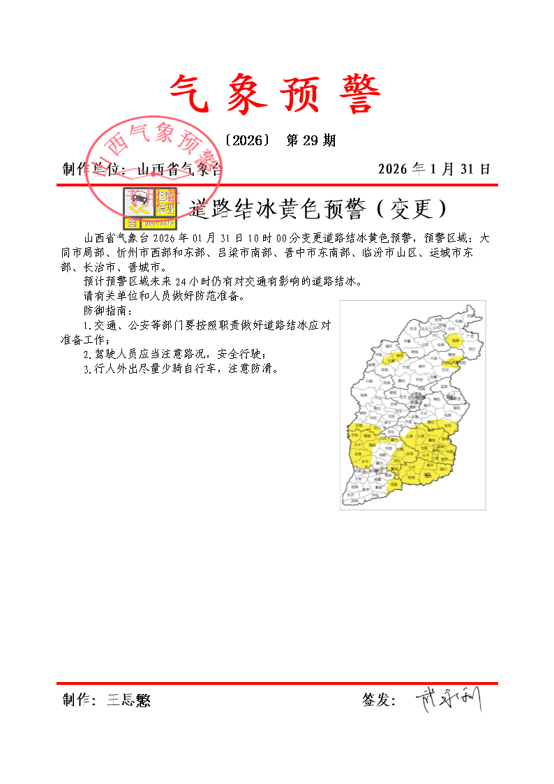 | 山西省氣象臺變更道路結(jié)冰黃色預(yù)警 |
