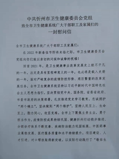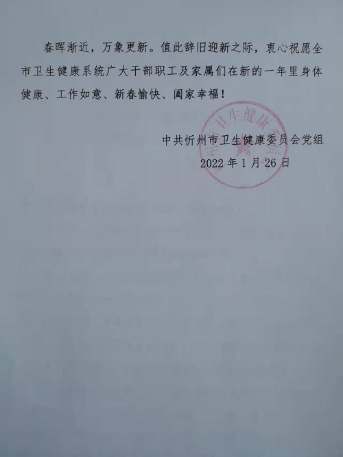 在2022年新春佳節(jié)即將來臨之際,市衛(wèi)生健康委員會黨組向你們致以親切的問候和誠摯的祝福!