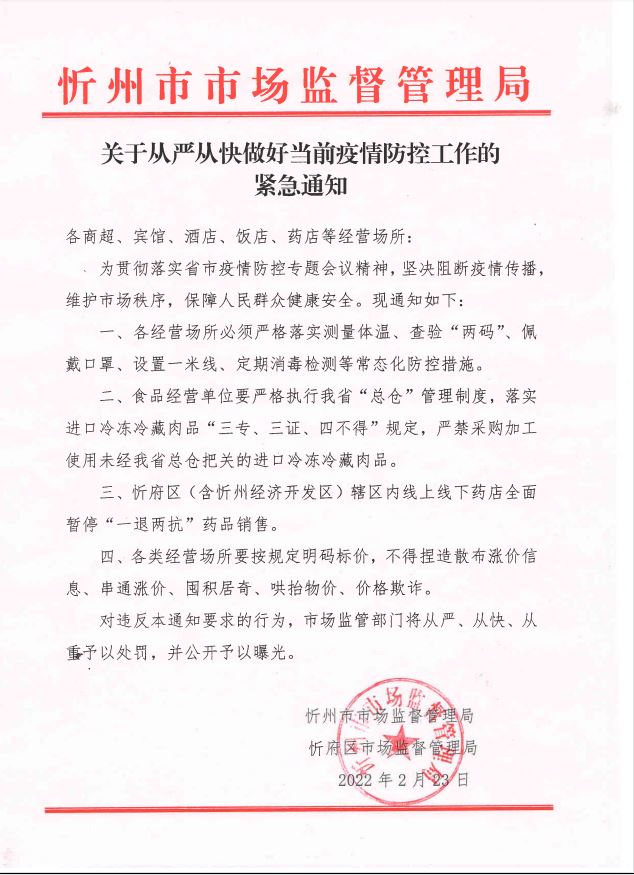 為貫徹落實省市疫情防控專題會議精神,堅決阻斷疫情傳播,維護(hù)市場秩序,保障人民群眾健康安全。現(xiàn)通知如下:
