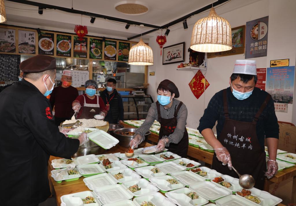 “那個(gè)餐盒再加點(diǎn)菜,湯要另外盛。”2月28日上午11時(shí),忻州古城的神池?zé)跹蛉獠宛^里,趙海英正忙亂地招呼著店員們將剛出鍋的菜分裝到餐盒里,丈夫武海軍將打包好的餐盒裝到車上。為了準(zhǔn)備這份愛(ài)心午餐,夫婦二人當(dāng)天上午8點(diǎn)就開(kāi)始在后廚里準(zhǔn)備。從配菜、烹制到打包、送餐,他們都格外用心,嚴(yán)格把關(guān)。
