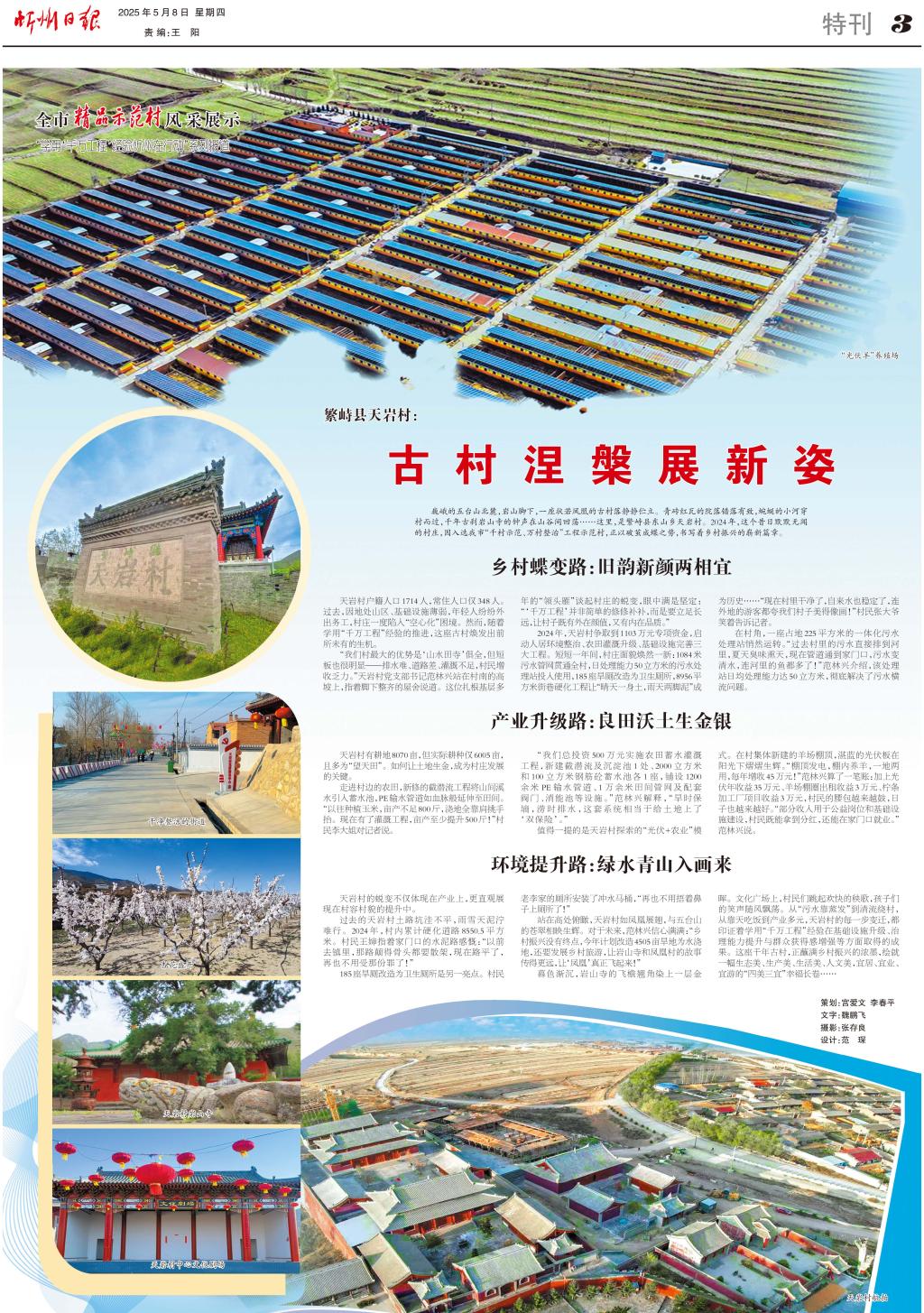站在高處俯瞰,天巖村如鳳凰展翅,與五臺山的蒼翠相映生輝。對于未來,范林興信心滿滿:“鄉(xiāng)村振興沒有終點(diǎn),今年計(jì)劃改造4505畝旱地為水澆地,還要發(fā)展鄉(xiāng)村旅游,讓巖山寺和鳳凰村的故事傳得更遠(yuǎn),讓‘鳳凰’真正飛起來!”