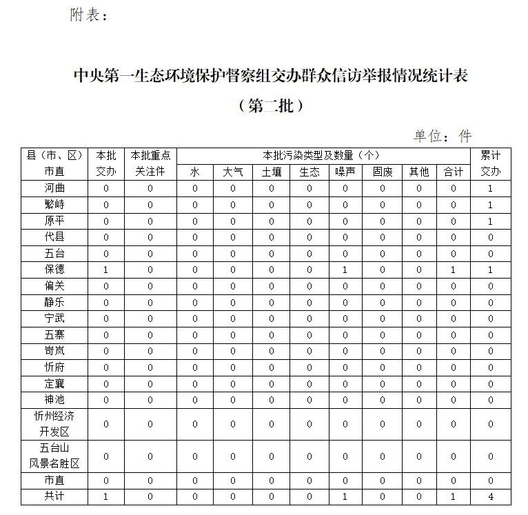 按區(qū)域和部門劃分,保德縣1件。本批轉辦的信訪件,涉及生態(tài)環(huán)境問題1個,其中,噪聲問題1個。