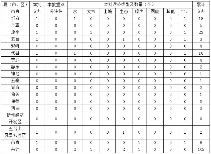 截至6月22日,中央第一生態(tài)環(huán)境保護(hù)督察組累計(jì)向我市交辦信訪件102件,其中重點(diǎn)關(guān)注件6件。交辦的信訪件中,涉及原平市23件、忻府區(qū)18件、代縣16件、市直單位8件、繁峙縣6件、寧武縣6件、定襄縣5件、保德縣5件、五臺(tái)縣3件、河曲縣3件、靜樂縣2件、岢嵐縣2件、五臺(tái)山風(fēng)景名勝區(qū)2件、五寨縣1件、偏關(guān)縣1件、神池縣1件;涉及生態(tài)環(huán)境問題102個(gè),其中生態(tài)破壞問題24個(gè)、大氣污染問題19個(gè)、土壤污染問題17個(gè)、其他污染問題15個(gè)、噪聲污染問題14個(gè)、水污染問題13個(gè)。