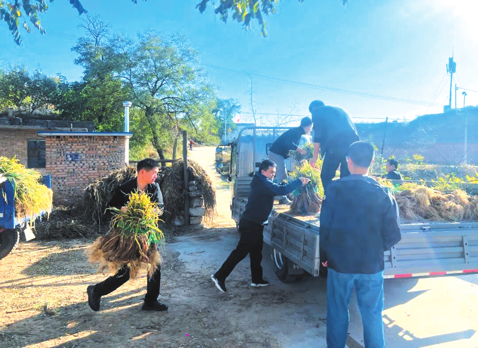 村里的部分孤寡老人,子女不在身邊,又缺乏交通工具,辛苦種植的紅蔥只能依賴商販來村定點(diǎn)收購,價(jià)格也不太理想。駐村第一書記阮傳飛說:“不能讓老百姓的汗白流,我們作為駐村的黨校人要行動(dòng)起來!”于是帶領(lǐng)隊(duì)員們化身“快遞員、裝卸工”,開著貨車與村干部一起來到農(nóng)戶門前,直接將紅蔥裝車運(yùn)往忻州市區(qū)銷售,打通紅蔥從農(nóng)田到餐桌的直銷通道。隊(duì)員們分工協(xié)作,稱重、捆綁、搬運(yùn)、碼放,汗水混著泥土浸濕了衣背卻無人停歇。一上午的工夫,就裝了滿滿一車。顧不得短暫休息,隊(duì)員們又馬不停蹄地趕往市區(qū),爭(zhēng)取在天黑前運(yùn)回市里進(jìn)行售賣。丁家溝75歲的焦大爺激動(dòng)地說:“多虧了這些駐村干部和年輕同志,要不是他們幫我想辦法,我這些蔥得啥時(shí)候才能賣出去啊!”