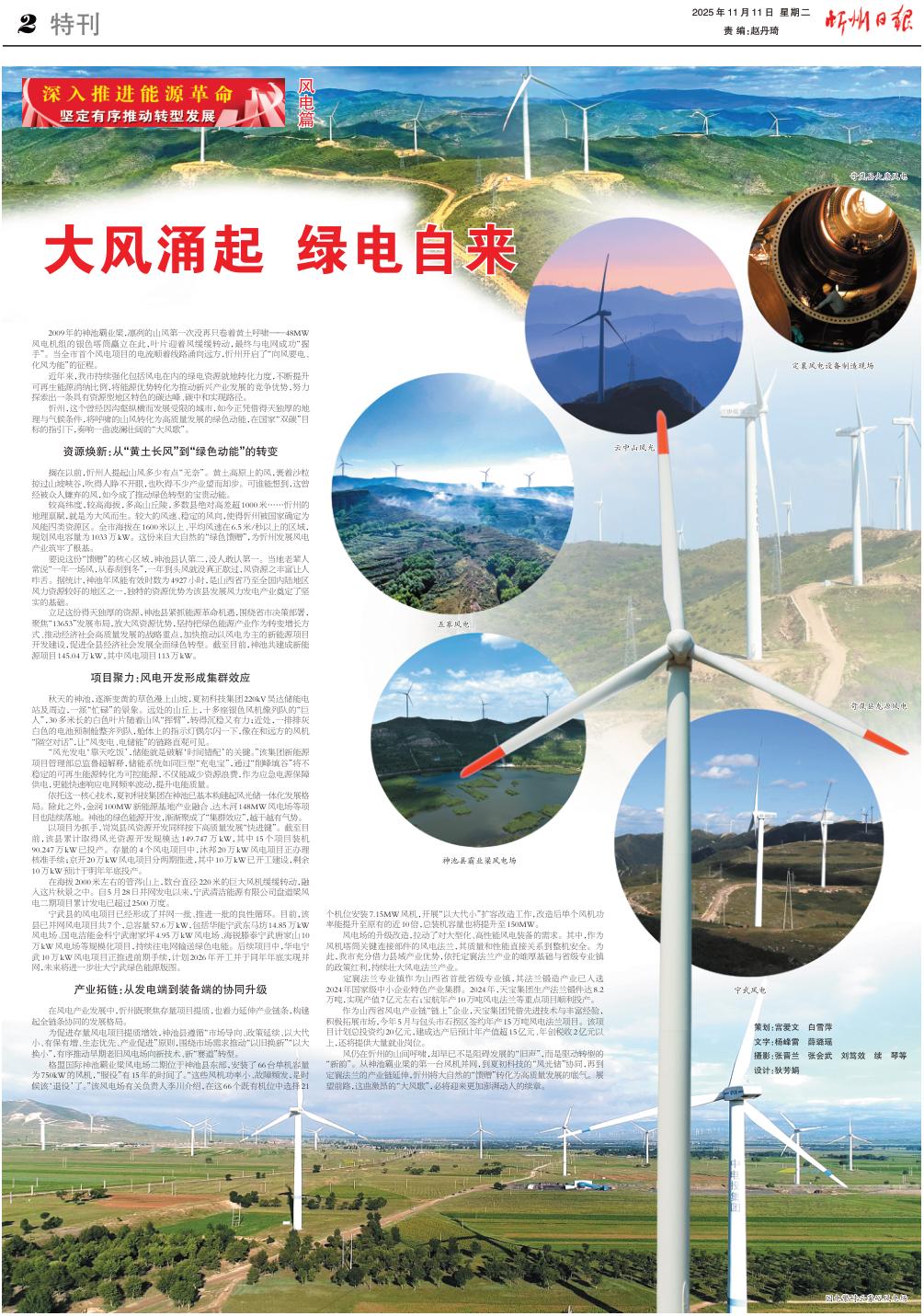 2009年的神池霸業(yè)梁,凜冽的山風第一次沒再只卷著黃土呼嘯——48MW風電機組的銀色塔筒矗立在此,葉片迎著風緩緩轉動,最終與電網成功“握手”。當全市首個風電項目的電流順著線路涌向遠方,忻州開啟了“向風要電、化風為能”的征程。 近年來,我市持續(xù)強化包括風電在內的綠電資源就地轉化力度,不斷提升可再生能源消納比例,將能源優(yōu)勢轉化為推動新興產業(yè)發(fā)展的競爭優(yōu)勢,努力探索出一條具有資源型地區(qū)特色的碳達峰、碳中和實現路徑。 忻州,這個曾經因溝壑縱橫而發(fā)展受限的城市,如今正憑借得天獨厚的地理與氣候條件,將呼嘯的山風轉化為高質量發(fā)展的綠色動能,在國家“雙碳”目標的指引下,奏響一曲波瀾壯闊的“大風歌”。 資源煥新:從“黃土長風”到“綠色動能”的轉變 擱在以前,忻州人提起山風多少有點“無奈”。黃土高原上的風,裹著沙粒掠過山坡峽谷,吹得人睜不開眼,也吹得不少產業(yè)望而卻步??烧l能想到,這曾經被眾人嫌棄的風,如今成了推動綠色轉型的寶貴動能。 較高緯度,較高海拔,多高山丘陵,多數縣絕對高差超1000米……忻州的地理稟賦,就是為大風而生。較大的風速、穩(wěn)定的風向,使得忻州被國家確定為風能四類資源區(qū)。全市海拔在1600米以上、平均風速在6.5米/秒以上的區(qū)域,規(guī)劃風電容量為1033萬kW。這份來自大自然的“綠色饋贈”,為忻州發(fā)展風電產業(yè)筑牢了根基。 要說這份“饋贈”的核心區(qū)域,神池縣認第二,沒人敢認第一。當地老輩人常說“一年一場風,從春刮到冬”,一年到頭風就沒真正歇過,風資源之豐富讓人咋舌。據統(tǒng)計,神池年風能有效時數為4927小時,是山西省乃至全國內陸地區(qū)風力資源較好的地區(qū)之一,獨特的資源優(yōu)勢為該縣發(fā)展風力發(fā)電產業(yè)奠定了堅實的基礎。 立足這份得天獨厚的資源,神池縣緊抓能源革命機遇,圍繞省市決策部署,聚焦“13653”發(fā)展布局,放大風資源優(yōu)勢,堅持把綠色能源產業(yè)作為轉變增長方式、推動經濟社會高質量發(fā)展的戰(zhàn)略重點,加快推動以風電為主的新能源項目開發(fā)建設,促進全縣經濟社會發(fā)展全面綠色轉型。截至目前,神池共建成新能源項目145.04萬kW,其中風電項目113萬kW。 項目聚力:風電開發(fā)形成集群效應 秋天的神池,逐漸變黃的草色漫上山坡,夏初科技集團220kV昊達儲能電站及周邊,一派“忙碌”的景象。遠處的山丘上,十多座銀色風機像列隊的“巨人”,30多米長的白色葉片隨著山風“揮臂”,轉得沉穩(wěn)又有力;近處,一排排灰白色的電池預制艙整齊列隊,艙體上的指示燈偶爾閃一下,像在和遠方的風機“隔空對話”,讓“風變電、電儲能”的鏈路直觀可見。 “風光發(fā)電‘靠天吃飯’,儲能就是破解‘時間錯配’的關鍵。”該集團新能源項目管理部總監(jiān)魯超解釋,儲能系統(tǒng)如同巨型“充電寶”,通過“削峰填谷”將不穩(wěn)定的可再生能源轉化為可控能源,不僅能減少資源浪費,作為應急電源保障供電,更能快速響應電網頻率波動,提升電能質量。 依托這一核心技術,夏初科技集團在神池已基本構建起風光儲一體化發(fā)展格局。除此之外,金潤100MW新能源基地產業(yè)融合、達木河148MW風電場等項目也陸續(xù)落地。神池的綠色能源開發(fā),漸漸聚成了“集群效應”,越干越有氣勢。 以項目為抓手,岢嵐縣風資源開發(fā)同樣按下高質量發(fā)展“快進鍵”。截至目前,該縣累計取得風光資源開發(fā)規(guī)模達149.747萬kW,其中15個項目裝機90.247萬kW已投產。存量的4個風電項目中,沐邦20萬kW風電項目正辦理核準手續(xù);京開20萬kW風電項目分兩期推進,其中10萬kW已開工建設,剩余10萬kW預計于明年年底投產。 在海拔2000米左右的管涔山上,數臺直徑220米的巨大風機緩緩轉動,融入這片秋景之中。自5月28日并網發(fā)電以來,寧武清潔能源有限公司盤道梁風電二期項目累計發(fā)電已超過2500萬度。 寧武縣的風電項目已經形成了并網一批、推進一批的良性循環(huán)。目前,該縣已并網風電項目共7個,總容量57.6萬kW,包括華能寧武東馬坊14.85萬kW風電場、國電潔能金科寧武謝家坪4.95萬kW風電場、海銳滕泰寧武唐家山10萬kW風電場等規(guī)模化項目,持續(xù)往電網輸送綠色電能。后續(xù)項目中,華電寧武10萬kW風電項目正推進前期手續(xù),計劃2026年開工并于同年年底實現并網,未來將進一步壯大寧武綠色能源版圖。 產業(yè)拓鏈:從發(fā)電端到裝備端的協(xié)同升級 在風電產業(yè)發(fā)展中,忻州既聚焦存量項目提質,也著力延伸產業(yè)鏈條,構建起全鏈條協(xié)同的發(fā)展格局。 為促進存量風電項目提質增效,神池縣遵循“市場導向、政策延續(xù)、以大代小、有保有增、生態(tài)優(yōu)先、產業(yè)促進”原則,圍繞市場需求推動“以舊換新”“以大換小”,有序推動早期老舊風電場向新技術、新“賽道”轉型。 格盟國際神池霸業(yè)梁風電場二期位于神池縣東部,安裝了66臺單機容量為750kW的風機,“服役”有15年的時間了。“這些風機功率小、故障頻發(fā),是時候該‘退役’了?!痹擄L電場有關負責人李川介紹,在這66個既有機位中選擇21個機位安裝7.15MW風機,開展“以大代小”擴容改造工作,改造后單個風機功率能提升至原有的近10倍,總裝機容