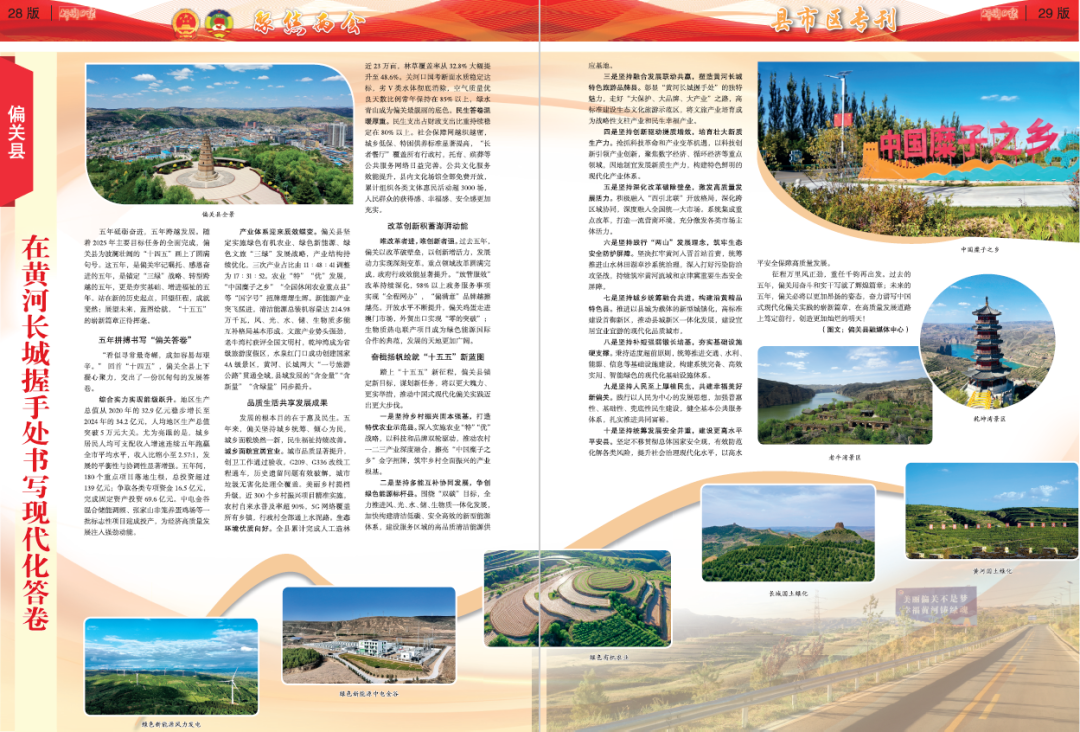 產(chǎn)業(yè)體系迎來(lái)質(zhì)效蝶變。偏關(guān)縣堅(jiān)定實(shí)施綠色有機(jī)農(nóng)業(yè)、綠色新能源、綠色文旅“三綠”發(fā)展戰(zhàn)略,產(chǎn)業(yè)結(jié)構(gòu)持續(xù)優(yōu)化,三次產(chǎn)業(yè)占比由11∶48∶41調(diào)整為17∶31∶52。農(nóng)業(yè)“特”“優(yōu)”發(fā)展,“中國(guó)糜子之鄉(xiāng)”“全國(guó)休閑農(nóng)業(yè)重點(diǎn)縣”等“國(guó)字號(hào)”招牌熠熠生輝。新能源產(chǎn)業(yè)突飛猛進(jìn),清潔能源總裝機(jī)容量達(dá)214.98萬(wàn)千瓦,風(fēng)、光、水、儲(chǔ)、生物質(zhì)多能互補(bǔ)格局基本形成。文旅產(chǎn)業(yè)勢(shì)頭強(qiáng)勁,老牛灣村獲評(píng)全國(guó)文明村,乾坤灣成為省級(jí)旅游度假區(qū),水泉紅門口成功創(chuàng)建國(guó)家4A級(jí)景區(qū),黃河、長(zhǎng)城兩大“一號(hào)旅游公路”貫通全域,縣域發(fā)展的“含金量”“含新量”“含綠量”同步提升。