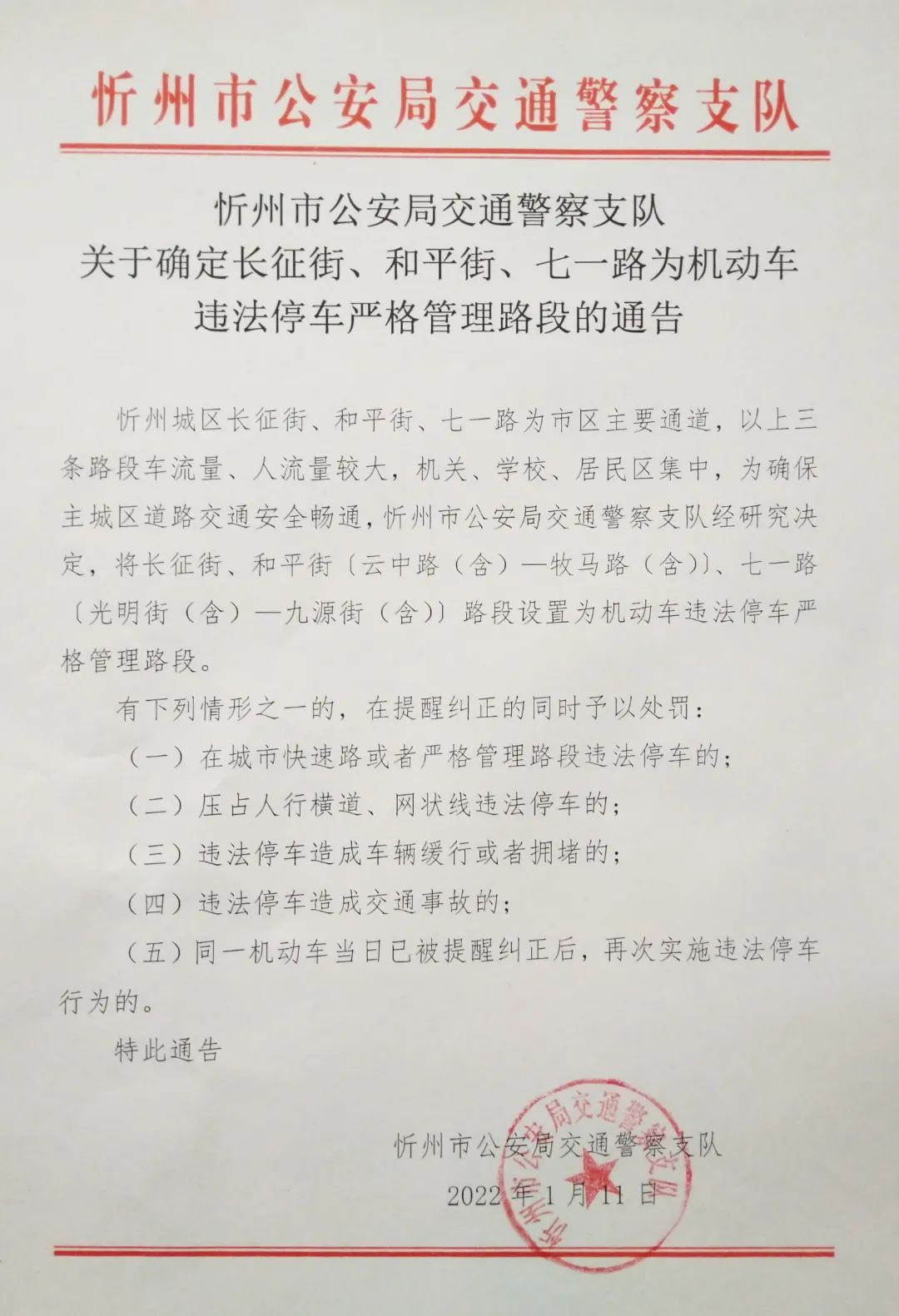 忻州市公安局交通警察支隊關(guān)于確定長征街、和平街、七一路為機動車違法停車嚴格管理路段的通告