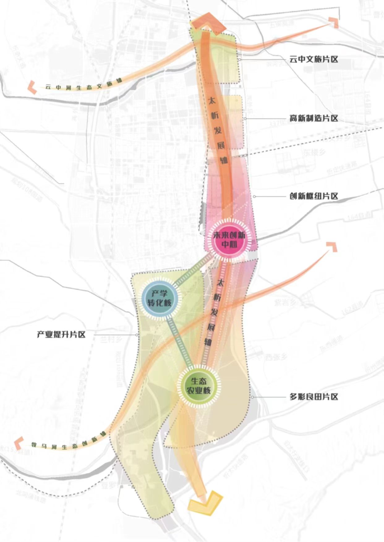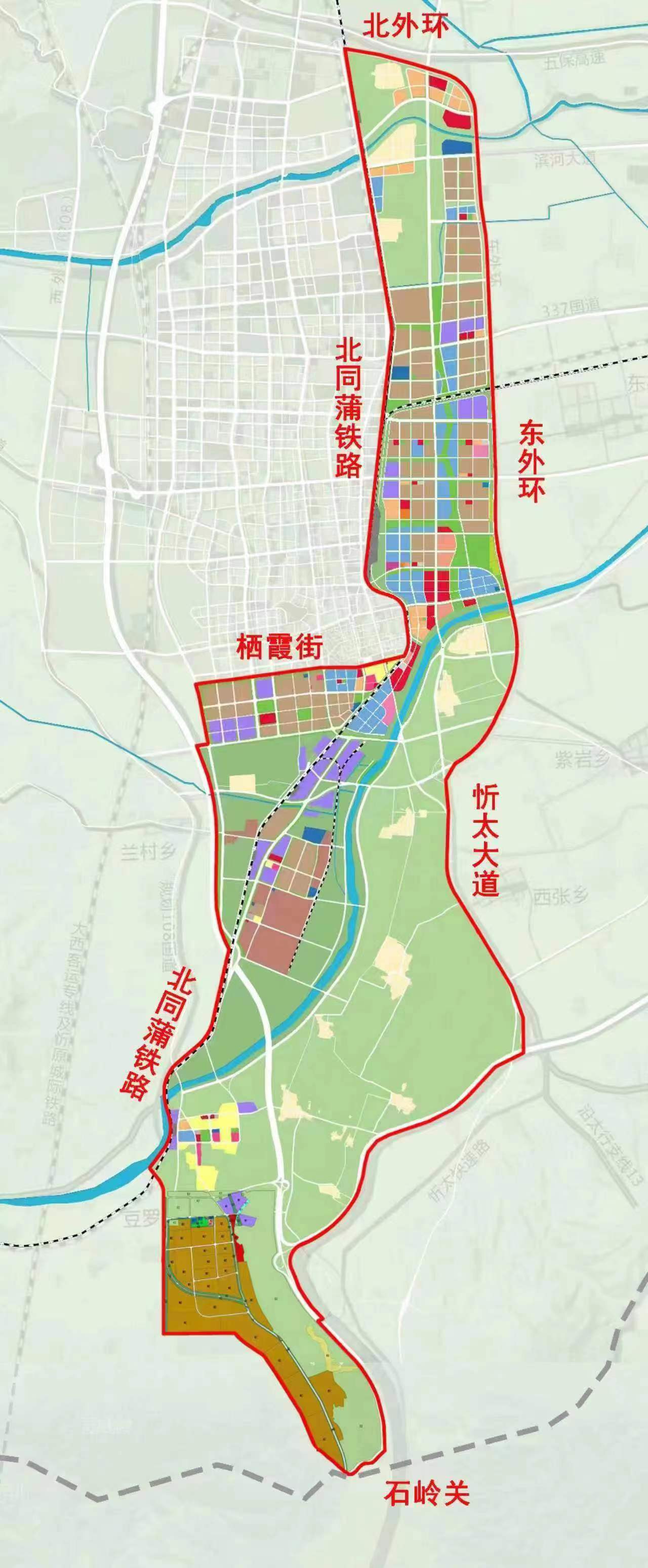規(guī)劃面積約100平方公里,北至北外環(huán),南至石嶺關(guān)(太原界),西至北同蒲鐵路,東至東外環(huán)。新區(qū)作為太忻一體化經(jīng)濟(jì)區(qū)忻州片區(qū)的啟動(dòng)區(qū),堅(jiān)持生態(tài)優(yōu)先、綠色發(fā)展,統(tǒng)籌生活、生態(tài)、生產(chǎn)三大空間,以“一心雙核、三軸五片區(qū)”規(guī)劃布局,預(yù)留未來(lái)產(chǎn)業(yè)發(fā)展用地,重點(diǎn)發(fā)展雜糧產(chǎn)業(yè)、現(xiàn)代物流產(chǎn)業(yè)、新能源材料產(chǎn)業(yè)、文旅產(chǎn)業(yè)和科技創(chuàng)新智造產(chǎn)業(yè),北部打造高新制造集合體、云中河?xùn)|段打造休閑度假文旅區(qū)、中部打造創(chuàng)新樞紐核心區(qū)、西南部打造產(chǎn)業(yè)提升區(qū)、東南部打造多彩良田示范區(qū),形成與大盂產(chǎn)業(yè)新城南北呼應(yīng)之勢(shì)。