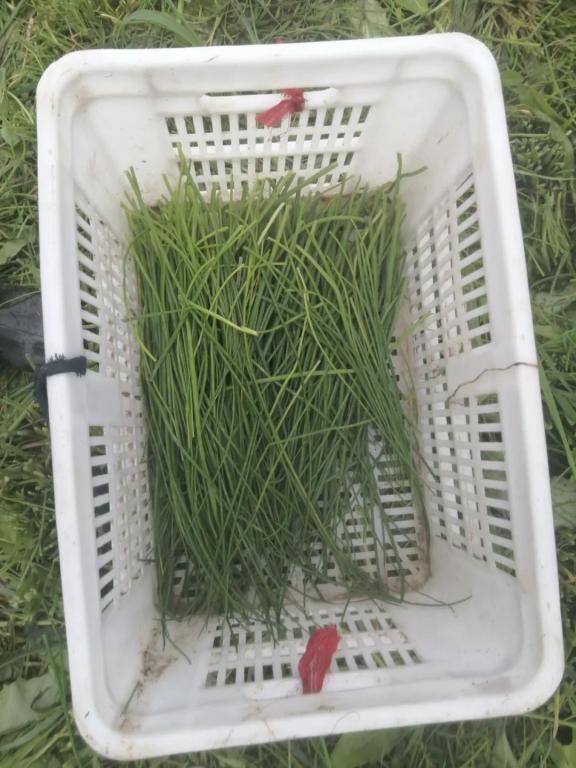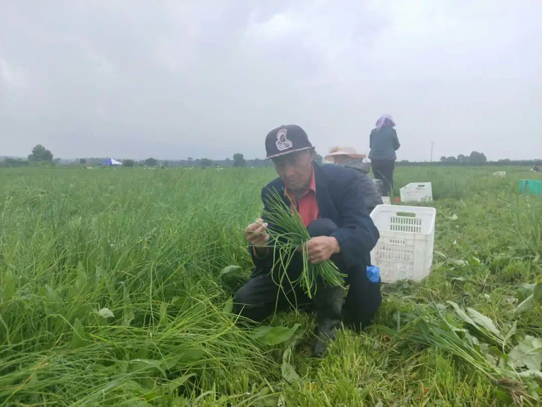 ▲小香蔥種植基地俯瞰圖 在右玉縣威遠(yuǎn)鎮(zhèn)小香蔥種植基地,連片種植的小香蔥長勢喜人。三五成群的農(nóng)民穿著雨鞋,蹲在地里用小鐮刀割蔥,割下一把后把雜草撿出來,把黃尖掐掉,干凈整齊地擺進(jìn)筐子里。