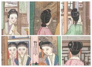 《大觀園圖》小姐、丫鬟的不同發(fā)型前后面,上列為小姐,下列為丫鬟 而寶玉在這幅三米多的橫披中出現(xiàn)了不止一次。對寶玉出現(xiàn)的次數(shù),前人有六次和七次兩種說法,許軍杰在對原畫作進(jìn)行仔細(xì)辨認(rèn)后,發(fā)現(xiàn)寶玉在原畫中共重復(fù)出現(xiàn)了八次之多?!皩氂裨诋嬜髦卸啻纬霈F(xiàn)。他頭戴懸著絳絨簪纓的束發(fā)嵌寶紫金冠,身著廣袖紫衫,外罩石青比甲,項(xiàng)上戴赤金盤螭瓔珞圈,圈上五色絲絳系著通靈寶玉。”許軍杰認(rèn)為,畫家用他串聯(lián)起了畫面的各個情節(jié)部分,且每處角度不同,表情各異,一一仔細(xì)繪出,力求符合情境,因此他無疑是繪制中的核心人物。