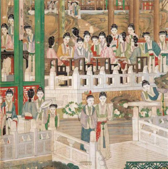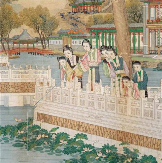 《大觀園圖》中賈寶玉的八次出現(xiàn) 畫面右側(cè)的建筑,最前景的蘅蕪院中,庭院外蕉葉舒展,拳石林立,雕花架上擺放著盆蘭。明間當(dāng)中設(shè)一紫檀條案,背后則又有山水字畫折屏;左右梢間兩側(cè)幾架列書函卷冊,上置古琴、錦盒等物;室內(nèi)青銅鼎、觚、汝窯瓷瓶等古玩點(diǎn)綴其間。在三間的四壁罩頂上皆掛著書法橫幅,飽含書卷氣息。寶玉與眾姊妹圍坐在案邊,正在觀看一伏案提筆、從容書寫的女子,這應(yīng)是黛玉。 畫面中,曲折縈紆的溪水自蘅蕪院流經(jīng)牡丹亭、凹晶館、蓼風(fēng)軒、秋爽齋等地,最終蜿蜒向畫面遠(yuǎn)方,層層亭臺廊橋,一望無盡。許軍杰認(rèn)為,此繪之溪水應(yīng)為沁芳溪。正如周汝昌先生在《北京大觀園·引言》中評價:“大觀園全部的主脈與‘靈魂’是一條蜿若游龍的‘沁芳溪’。亭、橋、泉、閘,皆以此二字為名,可為明證。一切景觀,依溪為境”,“大觀園的一切池、臺、館、泉、石、林、塘,皆以沁芳溪為大脈絡(luò)而盤旋布置?!眻D中的這曲溪水亦有異曲同工之功能,將兩岸建筑、山石、樹木巧妙地聯(lián)系在一起,使其形成一個有機(jī)的園林整體。(李君娜) (責(zé)任編輯:蔡文斌) |