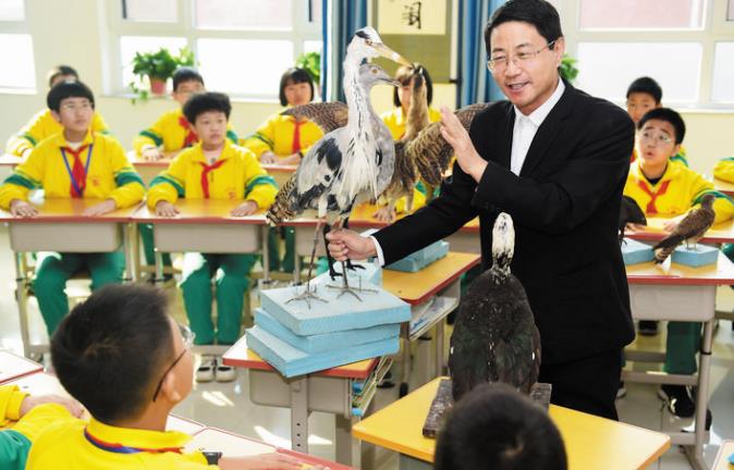 11月是河北省保護野生動物宣傳月,滄州市野生動物救護中心的專家走進中小學校,向?qū)W生們宣講愛鳥護鳥知識,引導孩子們從小樹立尊重自然的生態(tài)文明理念,積極參與野生動物保護活動。圖為11月10日,在滄州市河間英華學校,滄州野生動物救護中心的專家孟德榮教授為學生們講解愛鳥護鳥知識。新華社發(fā) 傅新春 攝