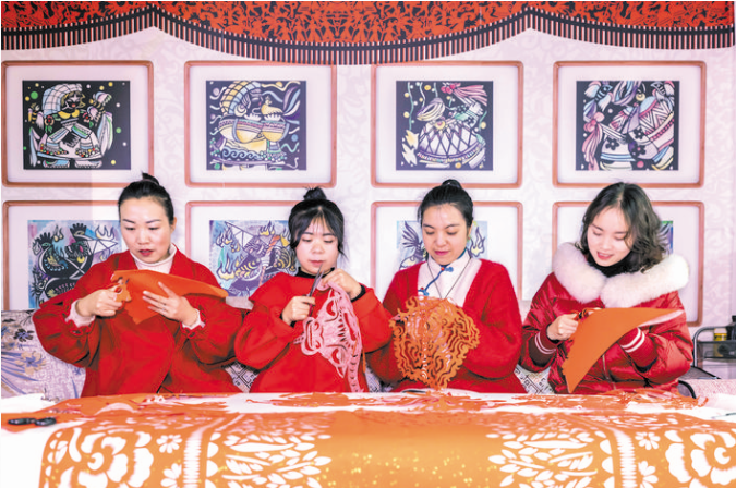 1月17日,岳紅霞(右二)帶領(lǐng)工作室學(xué)員創(chuàng)作“金牛送?!奔艏垺=?,曾獲全國剪紙大賽“金剪刀獎”、貴州省畢節(jié)市黔西縣非遺傳承人岳紅霞帶領(lǐng)工作室學(xué)員創(chuàng)作“金牛送?!毕盗兄黝}作品,迎接農(nóng)歷牛年。 (新華社發(fā) 范暉 攝)