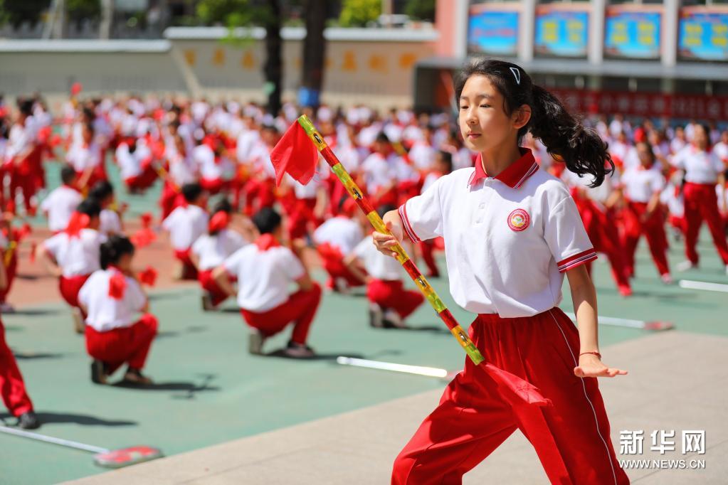 6月10日,在承德市雙橋區(qū)南營子小學(xué),學(xué)生在大課間上練習(xí)“霸王鞭”。近年來,河北省承德市雙橋區(qū)南營子小學(xué)以開展“陽光大課間”為平臺,將非遺民間舞蹈“霸王鞭”融入學(xué)校素質(zhì)教育實踐中,通過聘任專業(yè)老師,開設(shè)“霸王鞭”體育運動社團,引導(dǎo)小學(xué)生在大課間上練習(xí)“霸王鞭”,增強體質(zhì),傳承非遺。新華社發(fā)(劉環(huán)宇 攝)