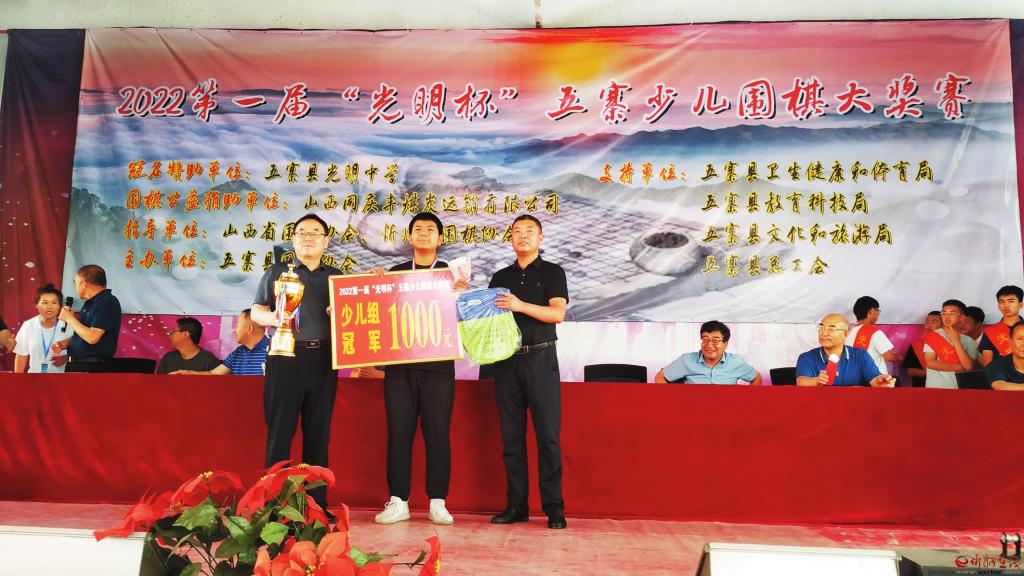 這次大獎賽由五寨縣圍棋協(xié)會主辦,五寨縣光明中學冠名贊助,山西同慶豐煤炭運銷有限公司贊助支持。開幕式上,山西省圍棋協(xié)會向五寨縣圍棋協(xié)會捐贈了價值8500元的智能一體機一臺,忻州市圍棋協(xié)會向五寨縣圍棋協(xié)會頒發(fā)了“立足五寨沃土,培養(yǎng)圍棋人才”的獎牌,并捐贈了價值7200元的高檔圍棋凳40個。山西省圍棋協(xié)會向五寨縣光明中學捐贈國學經(jīng)典書籍一套,山西人民出版社社長姚軍(圍棋5段)向大賽組委會贈送書法作品一幅。