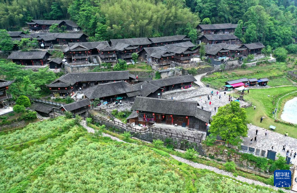 位于湖北省宣恩縣沙道溝鎮(zhèn)的彭家寨古吊腳樓群歷史悠久,吊腳樓保存完好,古樸雅致,是當?shù)孛袼孜幕糜蔚臒衢T打卡地(5月2日攝,無人機照片)。