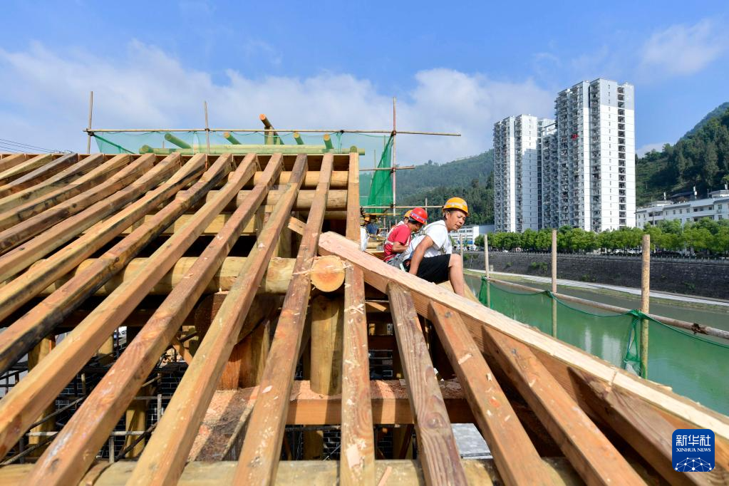 4月26日,在湖北省宣恩縣沙道溝鎮(zhèn)老岔村,村民在修建吊腳樓。