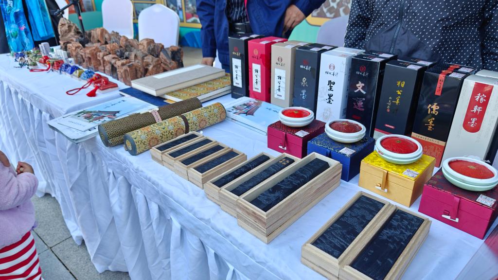 山東“秋季黃河大集”啟動(dòng)現(xiàn)場(chǎng),文創(chuàng)企業(yè)展示具有特色的文房用品。新華社記者蕭海川攝