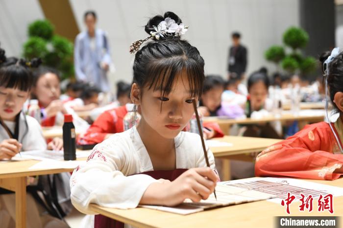 圖為9月7日,小朋友們在位于甘肅蘭州的甘肅簡牘博物館學習書寫簡牘中的文字。中新社記者 九美旦增 攝