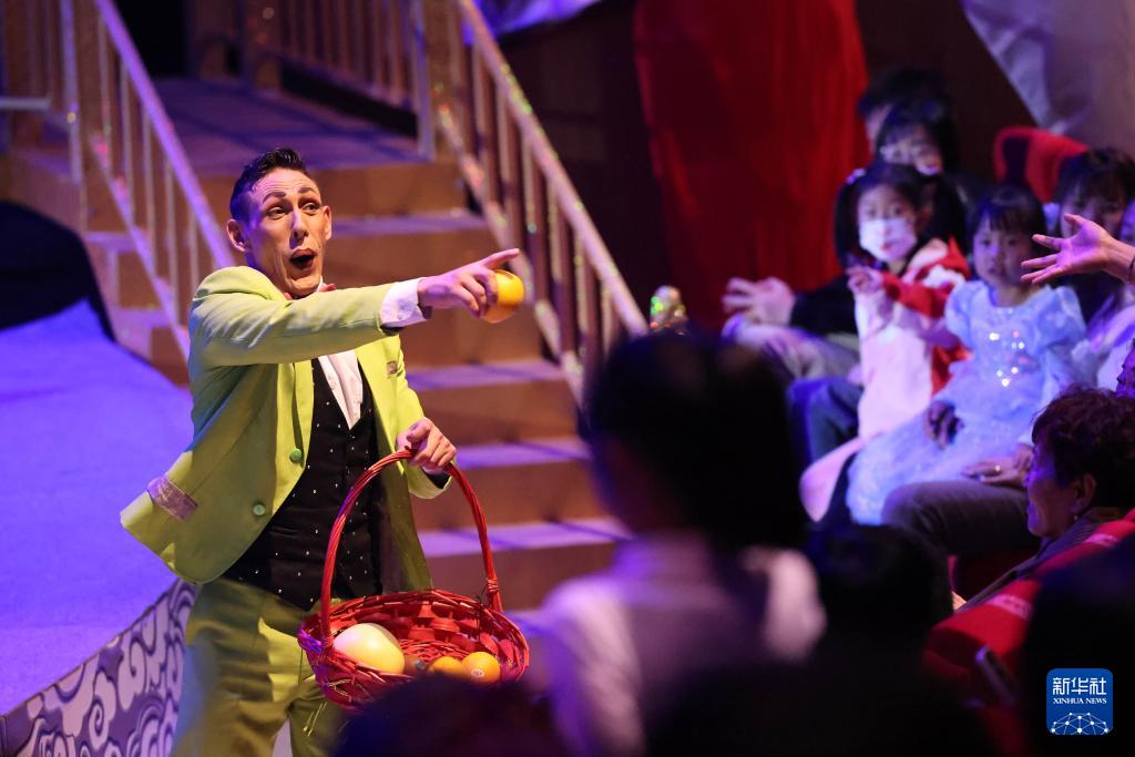 10月28日,演員在河北省滄州市吳橋縣吳橋雜技大世界景區(qū)江湖大劇院與觀眾互動。