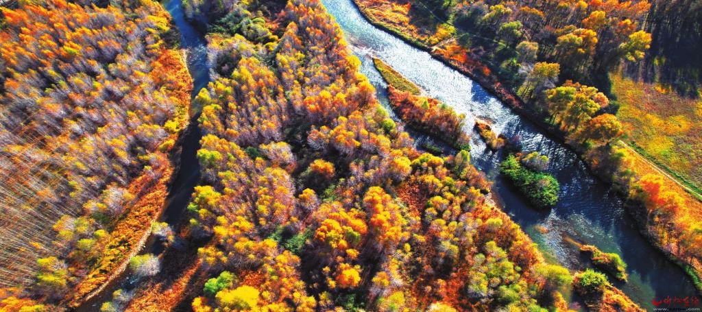 汾河兩岸景色美。圖為記者近日航拍的靜樂(lè)汾河川國(guó)家濕地公園秋景。(
