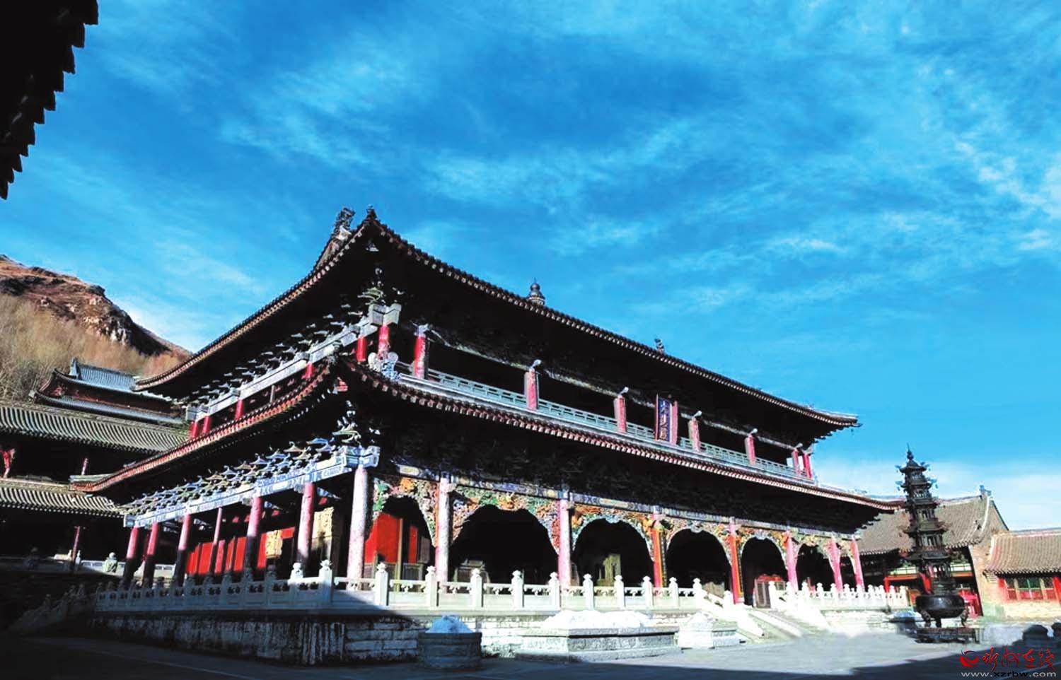 觀音殿后為樓殿,殿內(nèi)有19間石砌窯洞,為僧人寮房。中間的窯洞懸藍(lán)底金字匾額,上書“層巒聳翠”,內(nèi)砌石階連通樓上。二樓建有9個(gè)殿堂,分別為三霄殿、三皇殿、三官殿、玉皇殿、伽藍(lán)殿、毗盧殿、藥王殿、羅漢殿、地藏王殿。樓殿后是壯觀的大雄寶殿,殿中主塑釋迦牟尼佛,此外還有十八羅漢。