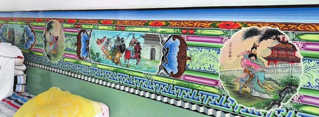 炕圍畫也叫墻圍畫,距今已有1200多年歷史,是原平人特有的“根脈性”藝術(shù)。手工藝人以墻為紙,將民族文化與當?shù)厣?、精神巧妙融合,造型藝術(shù)集壁畫、年畫和建筑彩繪于一體,定格于墻壁之上,代代相傳?!?7歲起,我就跟隨父親學習炕圍畫技藝,如今有60多年了?!惫M壽感慨道,“以前家家戶戶都會在炕邊畫炕圍畫。隨著時代變遷,人們住進了樓房,我們就把炕圍畫畫在紙上?!?/p>