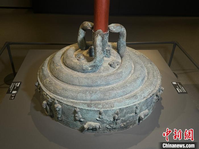 1月22日至3月2日,山西青銅博物館推出 “靈蛇獻(xiàn)瑞——乙巳蛇年生肖文物大聯(lián)展”。圖為戰(zhàn)國盤蛇鼓座。 中新社記者 楊靜 攝
