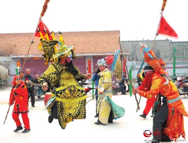 山西是民間社火之鄉(xiāng),定襄縣宏道鎮(zhèn)北社西村的大馬社火便是其中的佼佼者,也是較為獨(dú)特的一種。其特點(diǎn)是,集戲劇、舞蹈、武術(shù)、雜技、民樂(lè)和古代軍事布陣等為一體,用于民俗節(jié)慶、祭祀文化活動(dòng),整個(gè)表演過(guò)程沒(méi)有一句臺(tái)詞。據(jù)傳已有兩千多年的悠久歷史,傳承幾經(jīng)興盛和沉寂,最終得以完整地保留了下來(lái),由于場(chǎng)面宏大、生動(dòng)壯觀(guān)、審美價(jià)值較高,成為珍貴的民俗文化活化石。 把古代戰(zhàn)爭(zhēng)場(chǎng)面演練成劇,表現(xiàn)多為騎兵對(duì)戰(zhàn),故稱(chēng)為大馬社火。今年春節(jié)期間,定襄北社西村大馬社火被錄制成視頻上傳后,成為最受歡迎的鬧紅火視頻之一,人們紛紛轉(zhuǎn)載,贊不絕口。剛剛過(guò)去的元宵節(jié),大馬社火也是定襄鬧元宵不可或缺的重頭戲,北社西村眾多村民自發(fā)組織起來(lái)耍社火,表達(dá)祈福驅(qū)邪,對(duì)風(fēng)調(diào)雨順、豐產(chǎn)增收的祈愿,形成了一道獨(dú)特的傳統(tǒng)民間文藝風(fēng)景,還吸引了山西省民間文藝家協(xié)會(huì)專(zhuān)家現(xiàn)場(chǎng)指導(dǎo),舉行了民間民俗文化調(diào)研座談會(huì)。