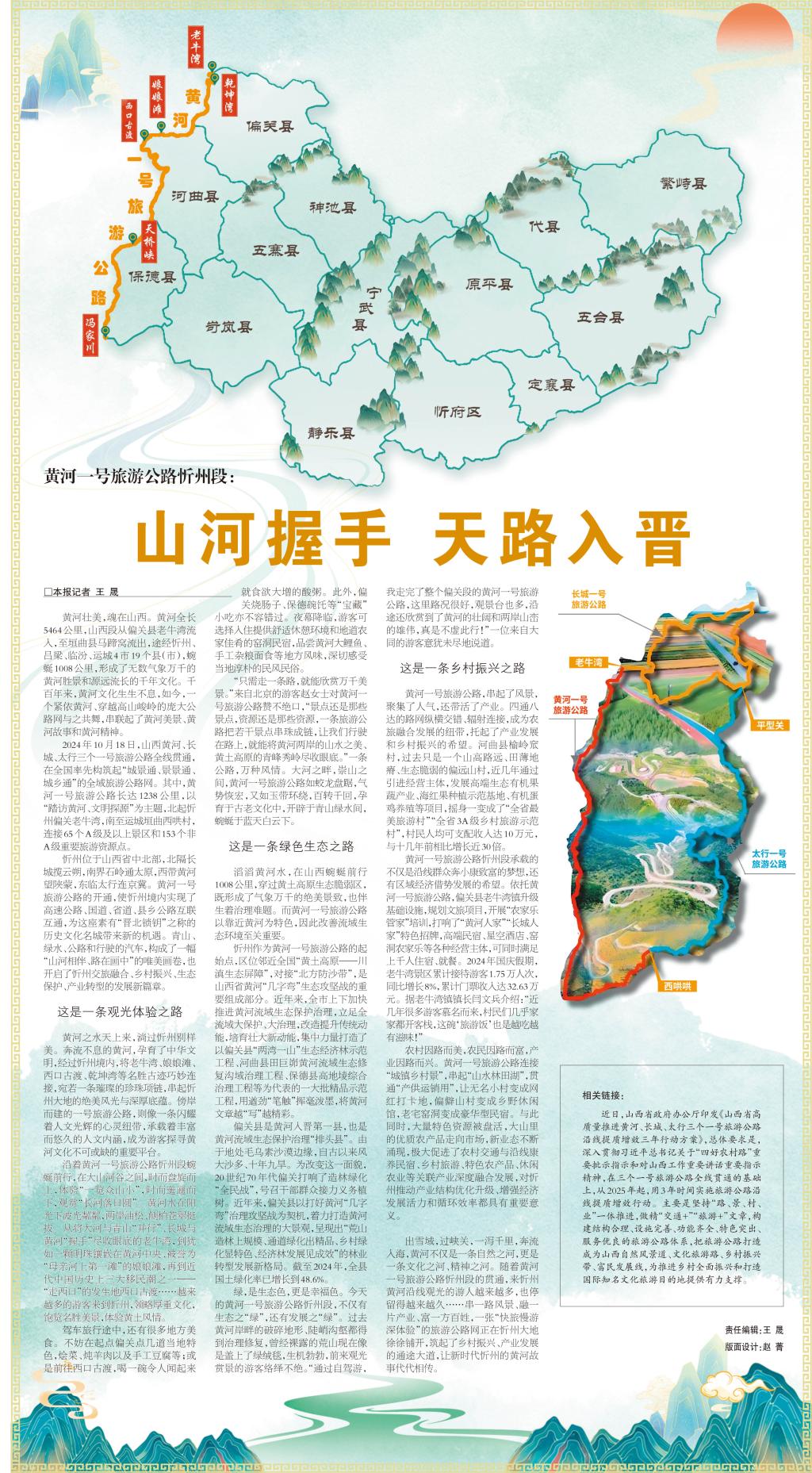 2024年10月18日,山西黃河、長(zhǎng)城、太行三個(gè)一號(hào)旅游公路全線貫通,在全國(guó)率先構(gòu)筑起“城景通、景景通、城鄉(xiāng)通”的全域旅游公路網(wǎng)。其中,黃河一號(hào)旅游公路長(zhǎng)達(dá)1238公里,以“踏訪黃河、文明探源”為主題,北起忻州偏關(guān)老牛灣,南至運(yùn)城垣曲西哄村,連接65個(gè)A級(jí)及以上景區(qū)和153個(gè)非A級(jí)重要旅游資源點(diǎn)。