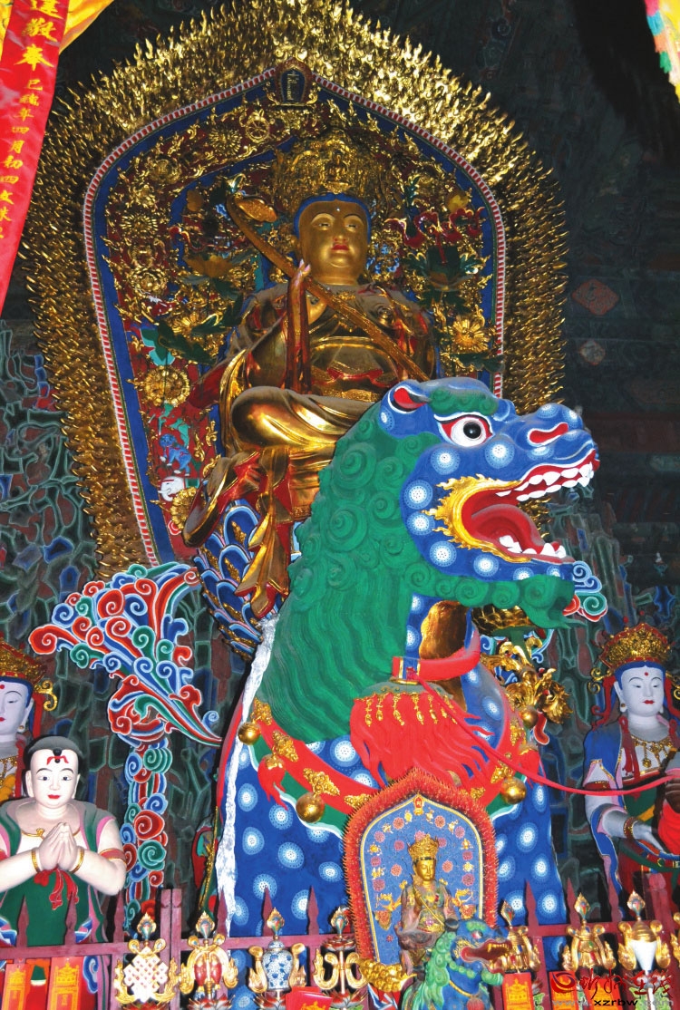 五臺(tái)山殊像寺大文殊殿里騎著狻猊的文殊菩薩塑像 高峰毅攝 文殊信仰的肇始 佛教徒認(rèn)為,五座臺(tái)頂象征著文殊菩薩的五種智慧,朝山信徒巡禮五頂,方為朝圣,稱為“大朝臺(tái)”。 五臺(tái)山稱之為名山的原因,并非因其瑰麗的自然風(fēng)光,而是由于這里是佛教的圣地、文殊菩薩的道場(chǎng)。那么文殊是何方神圣?其在佛教中的地位又如何?文殊為何選中了五臺(tái)山作為道場(chǎng)?讓我們一一道來(lái)。 文殊菩薩本是一個(gè)古印度的歷史人物,音譯作“文殊師利”“曼殊室利”,意為妙德、妙吉祥、妙樂(lè)、法王子,又稱“文殊師利童真”“孺童文殊菩薩”。公元前6世紀(jì),生于舍衛(wèi)國(guó)(今尼泊爾境內(nèi))的多羅聚落,婆羅門族姓,墜地能言,出生時(shí)有十余種祥瑞景象同時(shí)出現(xiàn)。長(zhǎng)大后,一心學(xué)佛,遍訪仙人,終于在釋迦牟尼處學(xué)得真經(jīng)被尊為菩薩。 文殊在佛教中的地位如何呢?《維摩詰所說(shuō)經(jīng)》說(shuō),維摩詰生病,釋迦牟尼要派一個(gè)大型代表團(tuán)前去慰問(wèn),派誰(shuí)當(dāng)團(tuán)長(zhǎng)?舍利弗等十六弟子,個(gè)個(gè)都不敢承擔(dān),都說(shuō)自己曾被維摩詰呵斥過(guò)。派彌勒等大菩薩,他們也稱不能勝任,表示自己挨過(guò)維摩詰的批評(píng)。最后終于派出以文殊為首,由八千菩薩、五百聲聞組成的龐大代表團(tuán),前往位于毗耶離城的維摩詰宅舍問(wèn)候。在《維摩詰所說(shuō)經(jīng)》中,記錄了文殊和維摩詰之間的對(duì)話。 《華嚴(yán)經(jīng)·入法界品》載:“文殊師利常為無(wú)量諸佛之母,常為無(wú)量菩薩之師,教化成就一切眾生,名稱普聞十方世界?!痹诖蟪朔鸾汤?,文殊是諸菩薩上首,常與普賢侍佛左右,所有佛弟子都把文殊當(dāng)作智慧的化身,稱般若為諸佛之母,文殊為七佛之師。常見(jiàn)的文殊像頂有五髻,表示五智無(wú)上無(wú)得之相;左手執(zhí)蓮花,花中放《般若經(jīng)》一部,表示般若一塵不染;右手執(zhí)寶劍,喻能斬群魔;或坐蓮花臺(tái),表示清凈,或乘獅子或孔雀,表示威猛。 介紹完文殊的身世,我們?cè)倏匆幌率钦l(shuí)將佛教傳入五臺(tái)山地區(qū)的。這個(gè)問(wèn)題目前比較一致的說(shuō)法是:由東晉的高僧道安和慧遠(yuǎn)將佛教傳入了五臺(tái)山。 道安俗姓衛(wèi),河北常山郡扶柳縣人,生于儒學(xué)世家,幼時(shí)喪失雙親,為外兄孔氏撫養(yǎng)。七歲上學(xué),讀書只讀一遍,再讀便能背誦,被街坊鄰里傳為神童。十二歲出家,由于相貌丑陋,不被師父喜歡,被趕到田里勞動(dòng)三年。但他毫無(wú)怨言,利用休息時(shí)間誦讀佛經(jīng)。后趙建武十一年(345年),他游學(xué)至鄴都寺廟,拜神僧佛圖澄為師。佛圖澄的佛學(xué)造詣?lì)H高,是一位備受后趙石勒、石虎二帝崇信的著名高僧。他一見(jiàn)道安,就對(duì)其淵博學(xué)識(shí)驚嘆不已。佛圖澄講法,道安每每都能復(fù)述,還會(huì)解答僧眾提出的疑難問(wèn)題,往往語(yǔ)出驚人,游刃有余,可謂佛圖澄的得力助教,故當(dāng)時(shí)有“漆道人(道安膚色黝黑),驚四鄰”的說(shuō)法。前秦皇始三年(353年),道安在太行、恒山創(chuàng)立寺塔,聚眾講法,因恒山是五臺(tái)山的外圍地區(qū),所以有說(shuō)法稱“是道安第一次開(kāi)辟了五臺(tái)山佛教道場(chǎng)”。 清光緒版《山西通志·寺觀·崞縣》載:“樓煩寺,在縣西北二十五里,以樓煩城名。晉慧遠(yuǎn)演教地?!睍羞€說(shuō),代縣“白仁巖寺,在州西北三十里。白仁巖巨石上,晉慧遠(yuǎn)辟石為室,建樓觀、臺(tái)榭、殿廊、門廡、僧軒、廚庫(kù)俱備?!鼻“妗吨彪`代州志·輿地》中還介紹,白仁巖上“有石浮圖,峰頭有說(shuō)法臺(tái)、旗桿石、定心石、試心石、古南庵”等佛教勝跡。這些都是慧遠(yuǎn)當(dāng)年傳法布道的遺跡,且位于五臺(tái)山西臺(tái)之麓,是五臺(tái)山最早的一批寺廟,故曰慧遠(yuǎn)是出家于五臺(tái)山的僧人,也是最早將佛教傳入五臺(tái)山的高僧之一。