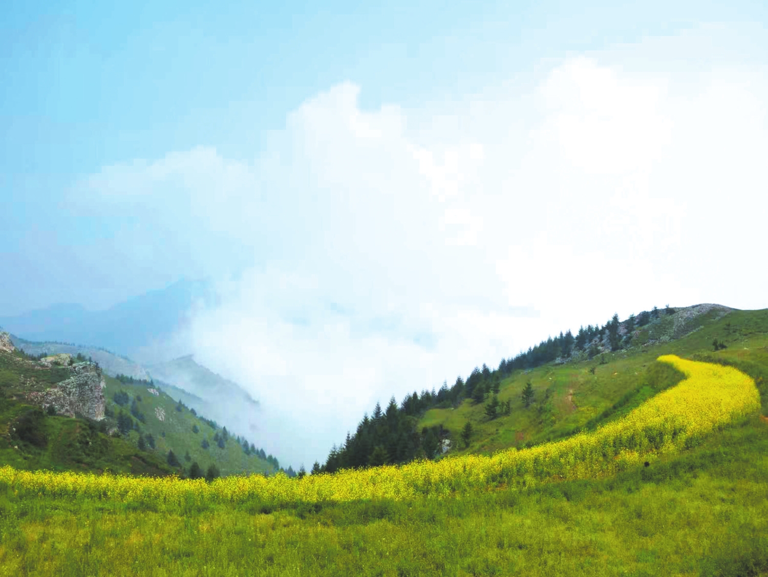 上到山頂,眼前豁然開(kāi)朗。近處有草坡鋪陳,松樹(shù)成林,遠(yuǎn)處卻是十萬(wàn)大山籠罩在濃密的云霧里,白茫茫無(wú)邊無(wú)際宛如汪洋大海。
