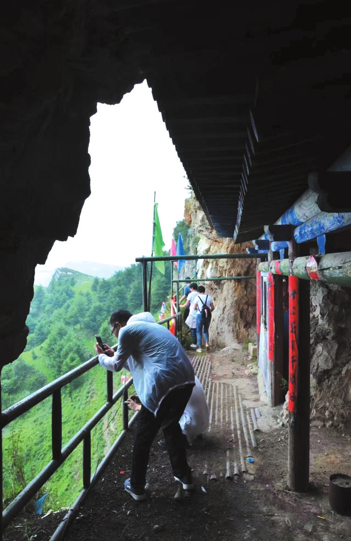 這座老君廟開(kāi)鑿于峰巒半腰,面臨絕壁,其險(xiǎn)異常。幸得今人用粗大鐵管焊接成簡(jiǎn)易護(hù)欄和扶手,游人才不至于恐高懼怕。