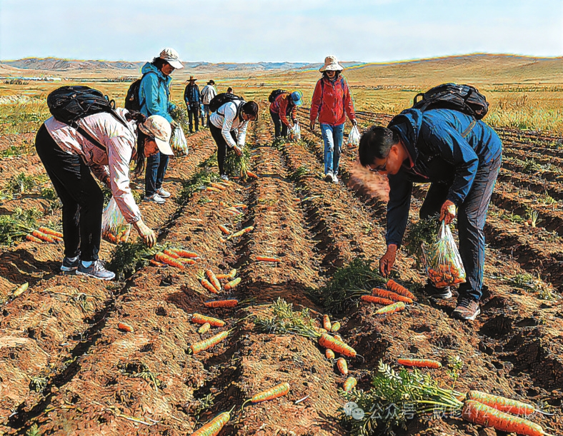 “撿秋”游演繹著“鄉(xiāng)土中國”的現(xiàn)代篇章。費(fèi)孝通在《鄉(xiāng)土中國》開篇即言“從基層上看去,中國社會(huì)是鄉(xiāng)土性的”。這種“鄉(xiāng)土性”的核心是人與土地的深度綁定。農(nóng)民靠土地生存,土地是文化認(rèn)同的根基?!皳烨铩边@種農(nóng)耕活動(dòng),如今以更加鮮活方式延續(xù)下來。對(duì)農(nóng)民而言,土地不僅是謀生手段,更是安身立命的“精神原鄉(xiāng)”。而城市游客的參與則賦予了“撿秋”新的意義。在城市里待久了,就想蹲在田里感受泥土的溫度,游客“撿秋”體驗(yàn)的是“春種秋收”踏實(shí)感。這種體驗(yàn)式參與是現(xiàn)代人對(duì)鄉(xiāng)土文明的“情感反哺”。游客們彎腰的身影既是對(duì)土地的致敬,也是對(duì)“根”的追尋。他們未必真懂農(nóng)事,但通過參與“撿秋”完成了對(duì)鄉(xiāng)土文化的認(rèn)同,被撿起的“果實(shí)”從“生存作物”演變?yōu)椤拔幕浇椤?。?dāng)前,內(nèi)蒙古各地推出的挖土豆、烤土豆等旅游項(xiàng)目是對(duì)鄉(xiāng)土資源的文化再“編碼”,當(dāng)土豆從田間走向游客的后備箱,“鄉(xiāng)土中國”便獲得了更加豐富的表達(dá)。